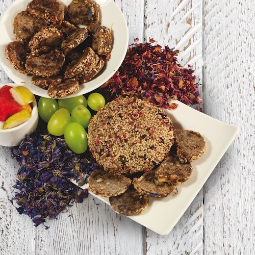 Violetta est disponible en deux saveurs différentes, toutes deux décorées de sésame et de fleurs comestibles.